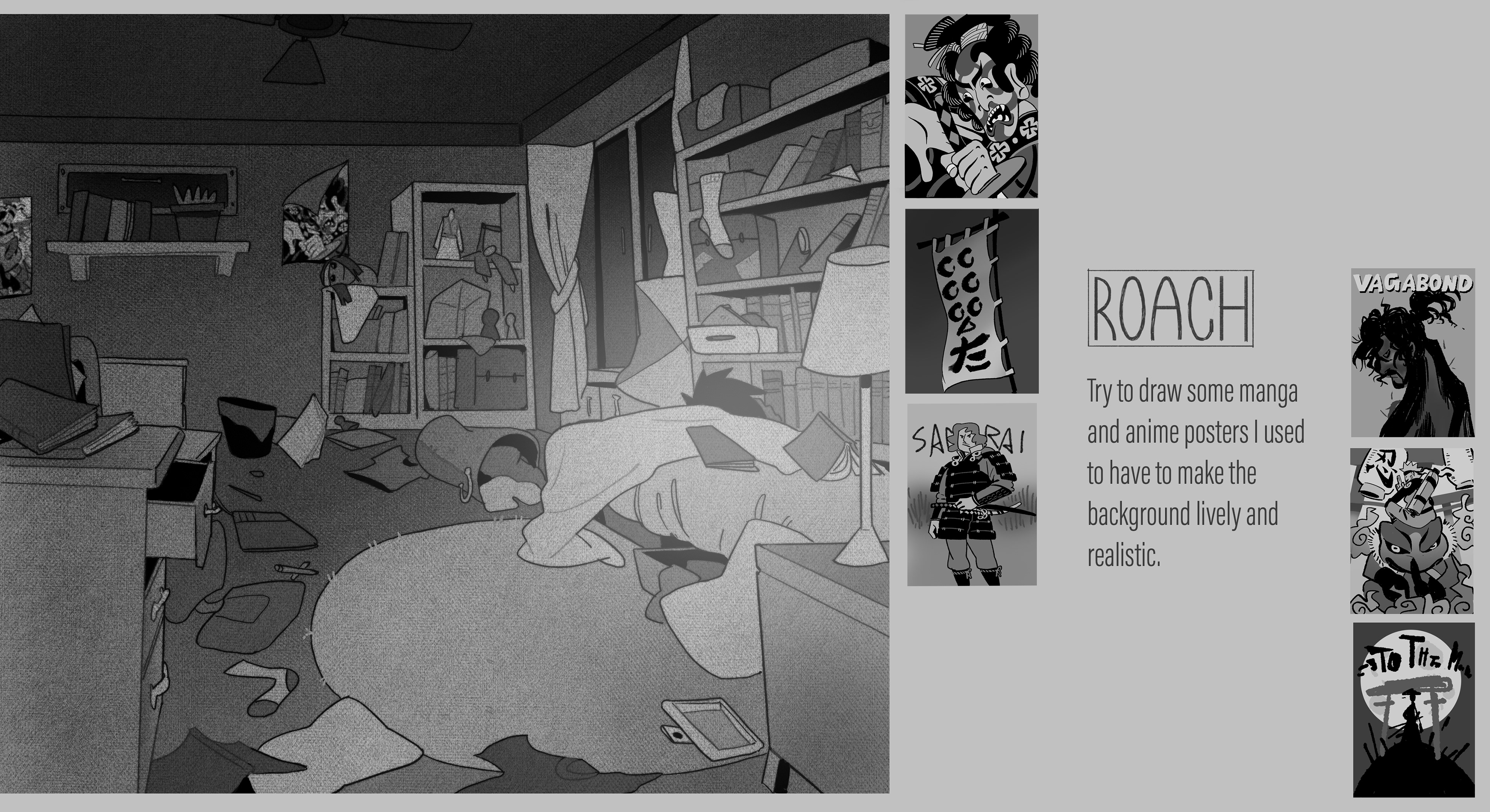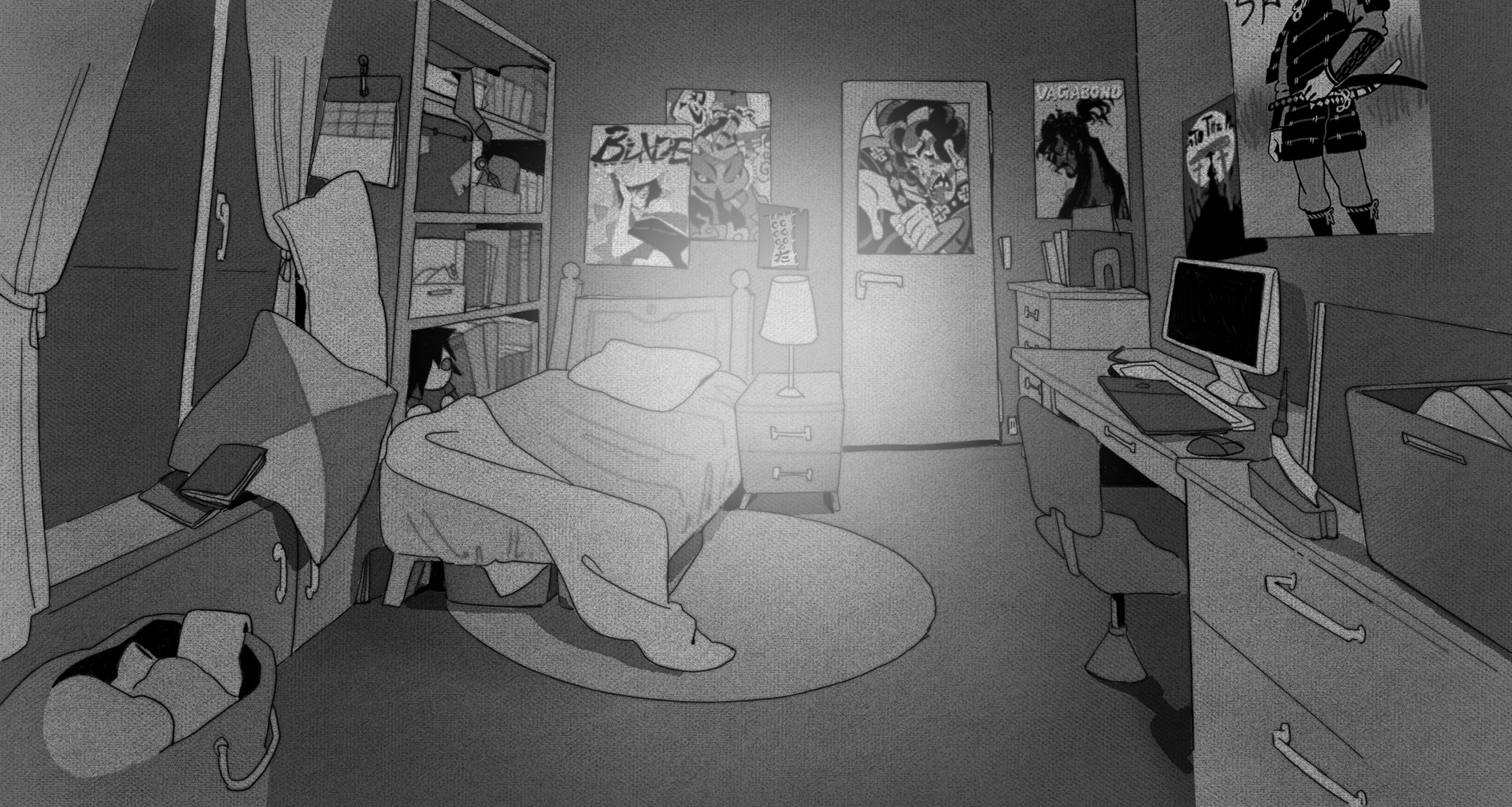 Here is some background I did for my film! I used the room I had as a child for reference since the story is based on my memory. It has a lot of comic books and anime posters, which I used to collect a lot.